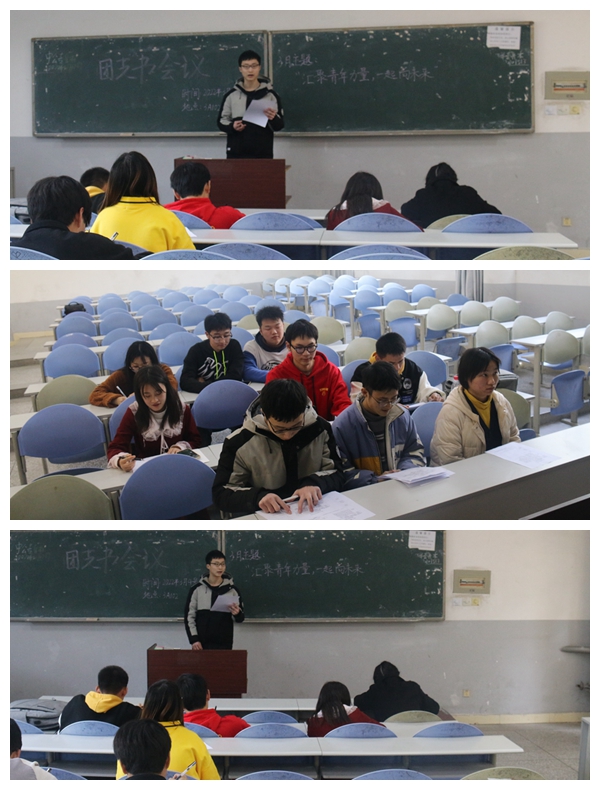 会议开始,由组织部干事各班团支书进行点到。会议中组织部部长刘文彬强调了几点问题:1、每班开展团课必须满足35分钟,过程中不可以有人出现开小差和中途退场的情况,其中有上厕所的同学要进行说明。2、对于开展团课时,有私人情况的同学要出示假条,请假人数是不可以进行更改的。3、板书问题以及演唱团歌的情况应在团课开展完毕后及时将开展表和考核表交到相应干事处。4、各班团支书要在每周星期四晚上22:00以前将各班青年大学习截图和完成同学名单做成压缩包发给组织部相应干事。