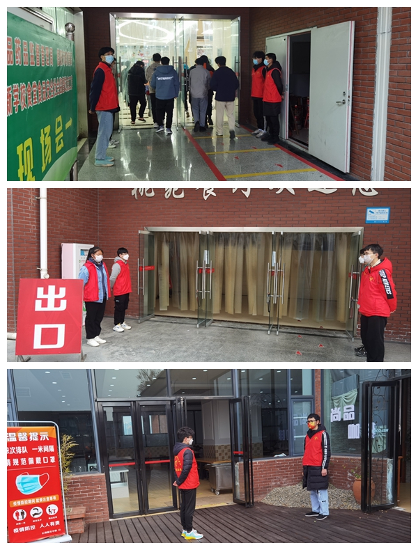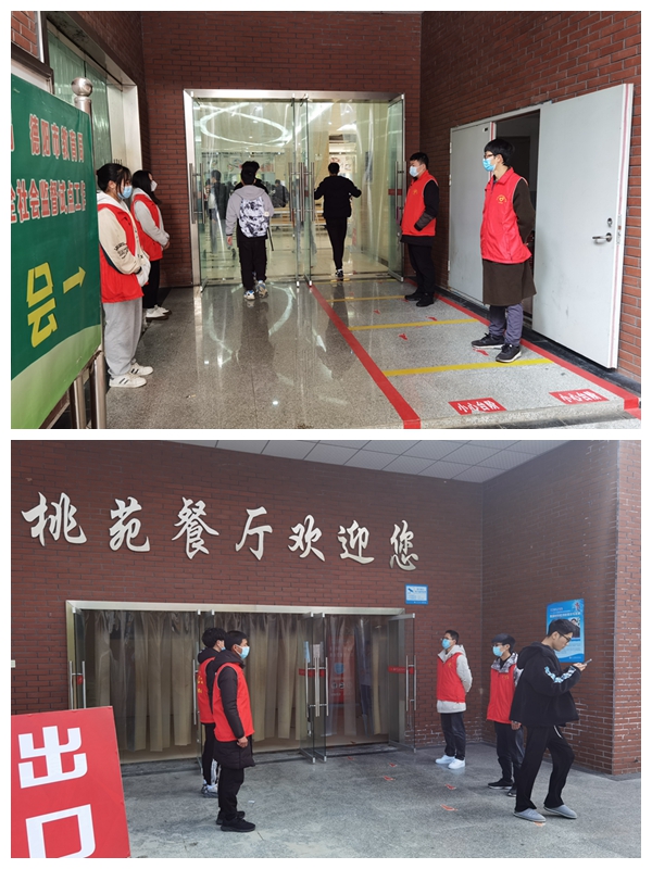 为确保食堂中午、晚上用餐高峰期防疫工作的有序进行。电气系在桃苑食堂一楼入口和出口分别设置了4个岗位,在三楼设置了两个岗位,以维护同学们进出秩序。志愿者每天11:30--13:00、17:30--19:00两个时间段站岗,各司其职,有条不紊地进行工作。食堂入口的志愿者负责提醒同学们佩戴好口罩,引导同学们进入食堂。出口的志愿者则提醒同学从正确出入口进出,为食堂防疫工作把好关。2月24日,食堂出入口防疫志愿者正式上岗,电气系共有80名志愿者参与其中。