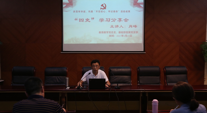 2021年6月25日下午,我校党委委员、院长肖峰在图书馆107会议室以“‘四史’蕴藏的精神特质”为主题,为基础部直属党支部、教育教学党总支全体教工的党员讲党课。