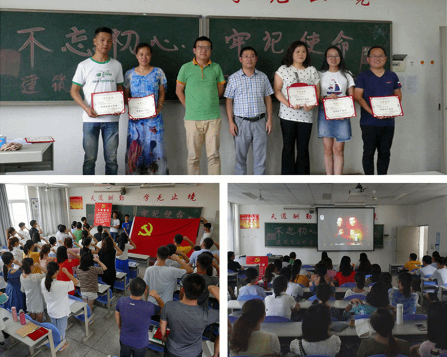 建筑工程系党总支的表彰大会上,全体师生党员在党旗前重温入党誓词,共同观看邓稼先感人事迹《等待》,深刻体会一名共产党员的信念、坚守与付出。一句句感人的告白,一张张坚毅的面孔,一点一滴的成绩,一如既往的以身示范,是建筑工程系党总支对“不忘初心、牢记使命”最好的写照。