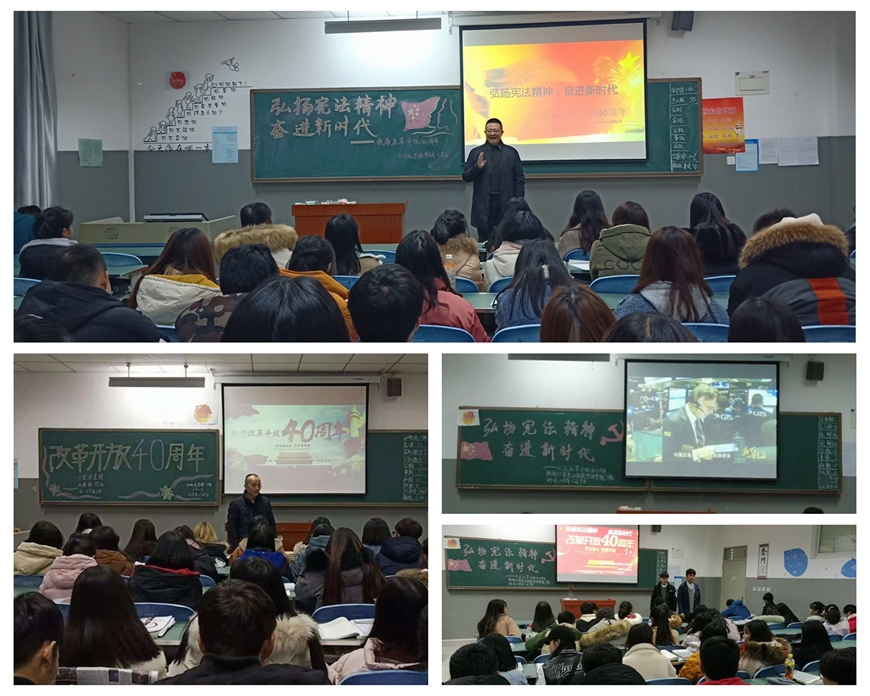 2018年12月9日晚,经管系2017级、2018级各班在班级教室召开了“弘扬宪法精神,奋进新时代——致敬改革开放40周年”主题班会。此次班会由各班班级导师主持。