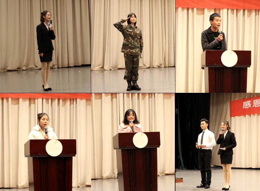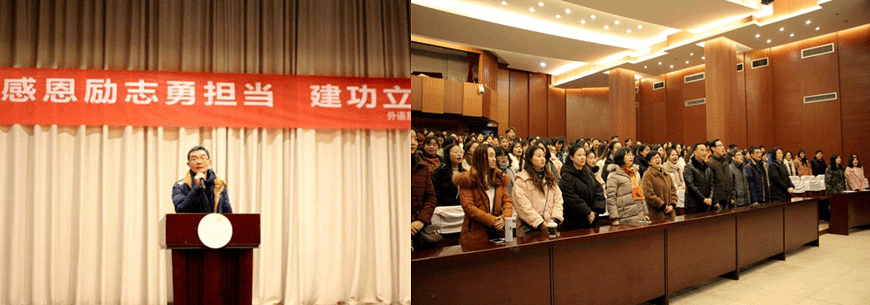 为全面学习贯彻党的十九大精神,纪念“一二·九”青年学生爱国运动83周年,弘扬爱国奋斗精神,增强青年大学生的责任感、使命感, 12月9日,我校外语系团总支在二教演讲厅开展“感恩励志勇担当,建功立业新时代”主题团日活动。党委学生工作部、团委、外语系党政领导出席活动。