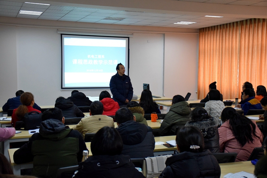 为进一步发挥课堂教学的育人主渠道作用,全面推进课程思政体系建设,2018年12月18日下午14:30,机电工程系课程思政教学示范课在二教405举行,学校党委书记司徒渝教授莅临示范现场并讲话。本次示范课经过系部推荐和遴选,由彭美武、邱红、蔡云松三位老师先后展示了专业课程如何课程思政,全系教师认真学习聆听。