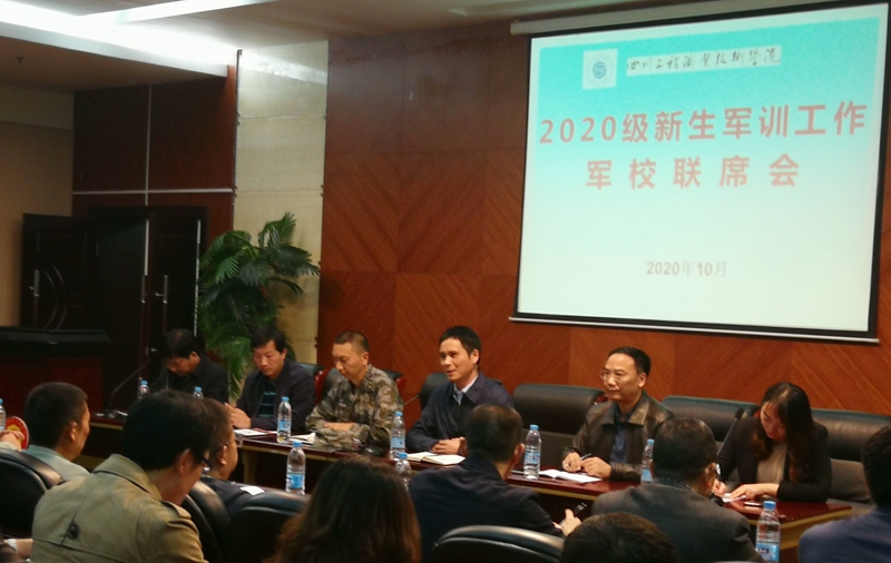 10月11日16:30,2020级新生军训联席会在图书馆107会议室举行,中国人民解放军德阳市旌阳区人民武装部首长及教官,学校领导,各系党总支书记、学生管理干事、新生班级辅导员及班主任,武装部、学生处等相关职能部门负责人及工作人员参加会议。会议由学校武装部副部长、保卫处副处长江昌兴主持。
