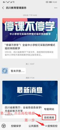 ● 进入“四川教育管理服务”公众号,点击右下角“疫情防控”,再点击“高校填报”,如下图: