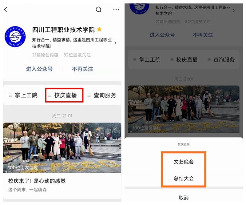进入“四川工程职业技术学院”微信公众号,在菜单栏中点开“校庆直播”,选择“文艺晚会”即可收看“四川工程职业技术学院60周年校庆文艺晚会”的直播盛况,选择“总结大会”即可收看“四川工程职业技术学院60年办学总结暨‘双高’建设推进大会”的直播盛况。如下图所示: