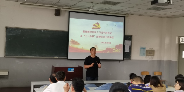 习近平总书记6月29日在“七一勋章”颁授仪式上的讲话引起了社会各界的强烈反响,基础教学部全体教师于7月6日下午,在直属支部书记余立勤的主持下,认真学习了习近平总书记的这一次讲话内容,再一次从“七一勋章”获得者的身上感受到了中国共产党人坚定信念、践行宗旨、拼搏奉献、廉洁奉公的高尚品质和崇高精神。