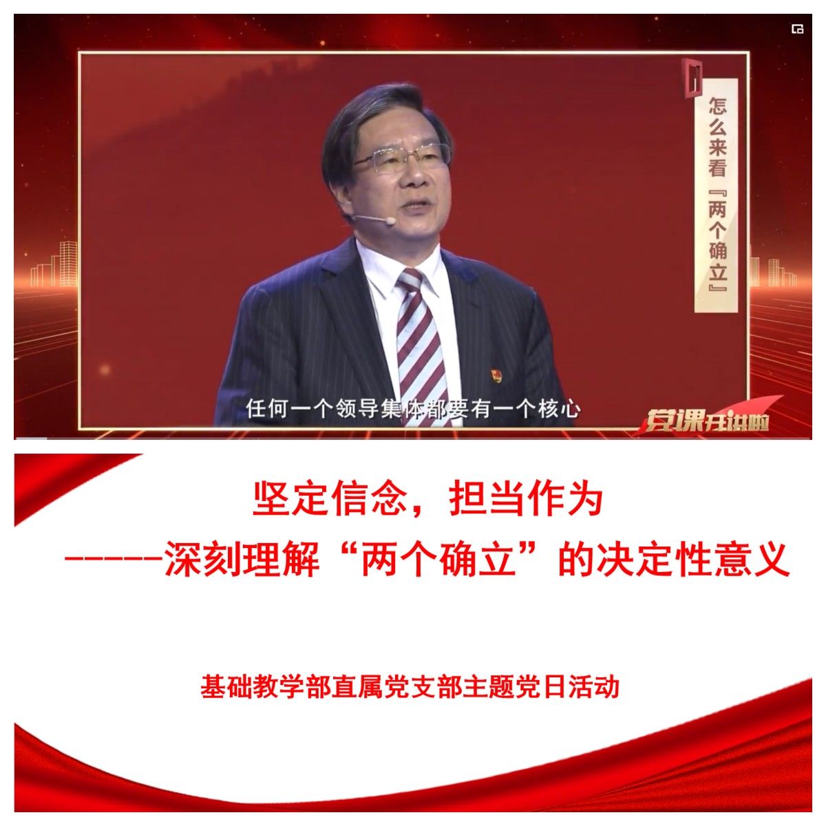 在学校创办本科的关键时期,为了激励广大党员教师再接再厉,锐意进取,不断为学校的发展事业奉献自己的力量,争取更大的成就,基础教学部全体党员借主题党日之机集中观看《党课开讲啦》第1期:怎么来看 “两个确立”。