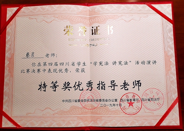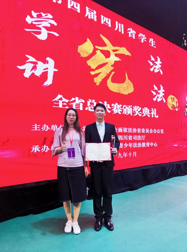 2019年10月13日下午,第四届四川省学生“学宪法讲宪法”全省总决赛暨颁奖典礼在四川师范大学举行,我校何峻岷同学荣获高校组演讲比赛特等奖,蝉联省赛冠军。