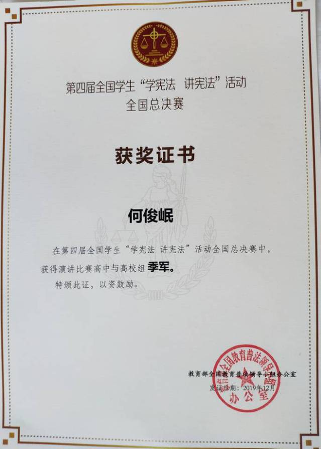 第四届全国学生“学宪法讲宪法”活动总决赛于2019年11月30日—12月3日在北京举行。由我部语文老师倾心指导的何俊岷同学作为省赛冠军代表四川省参加了全国高中高校组演讲总决赛,经过主题演讲、命题演讲两轮激烈角逐,最终夺得高中高校组演讲比赛全国季军并摘得特等奖最高荣誉。