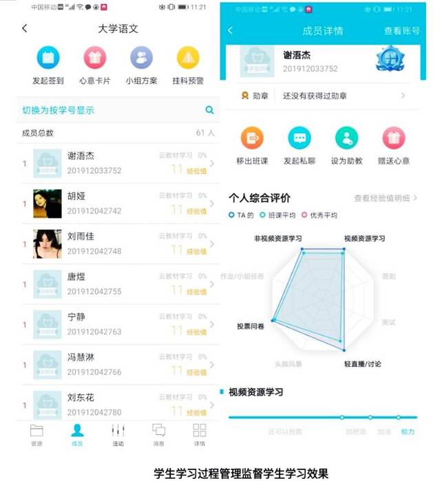 3.过程管理。教学团队通过云班课等互动平台,建立小组成员方案,布置小组研讨任务,并将习题与活动的难度进行梯度划分,便于拉开组间差距。在活动评价中通过教师评价、组间互评建立小组竞争机制。除此之外,为了让学生真正体会到语文学习的乐趣,教学团队还将通过云班课开辟写作园地与个人秀空间,丰富线下学习形式,学生可上传作业、视频、音频等,并在答疑/轻直播讨论群即时讨论问题,分享成果,多种途径获得经验值,既激励学生自主学习,又形成同伴竞争机制。而过程管理数据则既便于教师及时监测学生线下学习效果,同时将在开学后为线下教学提供数据参考。