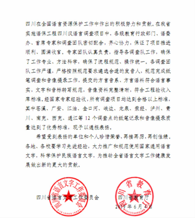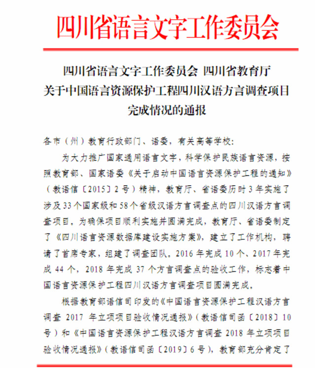 基础教学部语文教研室刘凯老师团队从2017年开始承担了中国语言资源保护工程四川汉语方言调查项目,历时两年共完成了江油点、旺苍点、岳池点和北川点等四个项目的汉语方言调查,采集了大量方言一手资料,顺利完成了调查任务并通过验收。经过国家专家组的验收评审,在四川省完成的91个方言点调查项目中评选了12个优秀调查项目,刘凯老师团队承担的江油点调查项目获此殊荣。