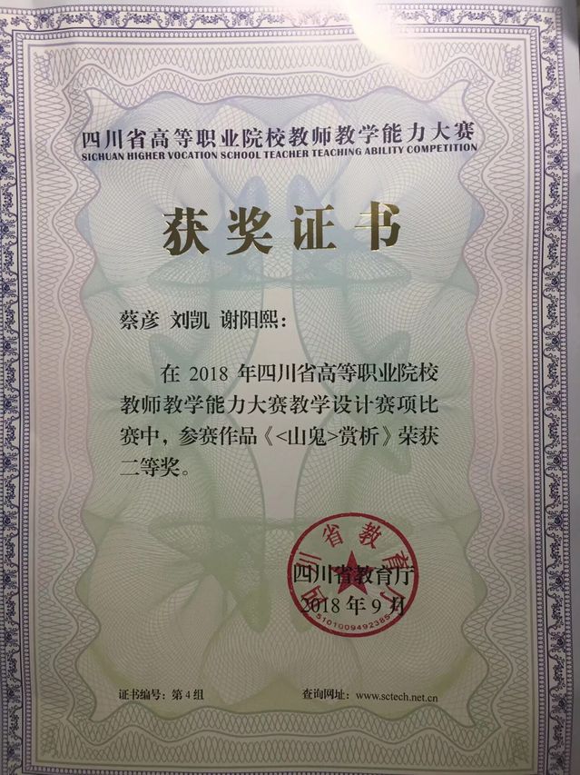 今年的高职院校教师教学能力大赛从三月份就开始,历时整整半年,共分为教学设计、课堂教学、和实训教学三个板块。主题也由最初的信息化教学大赛改为教师教学能力大赛,弱化了信息化,突出了教师教学能力。我部语文教研室组建了以蔡彥老师为主讲人的团队参加了信息化教学设计大赛。在经过课程设计、微课制作、课程摄制、参赛音视频制作等一系列复杂而辛苦的准备后,该团队提交的作品《〈山鬼〉赏析》在全校的几十个队伍中脱颖而出,荣获全校一等奖,并作为学校代表作品之一参加四川省高职教师教学能力大赛。在全省两百多个作品中顺利通过选拔进入决赛。