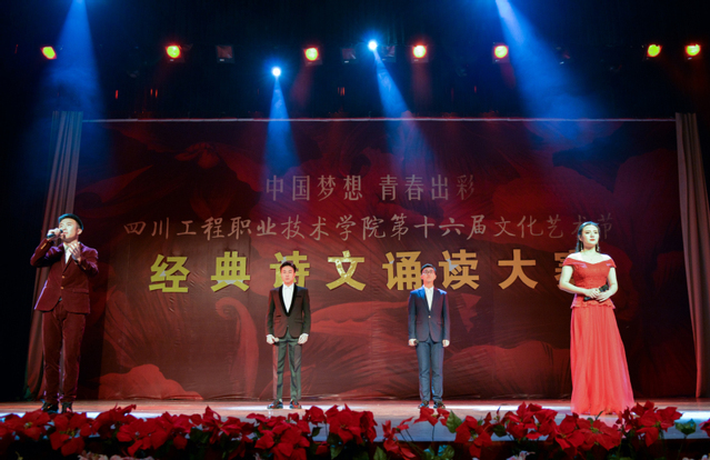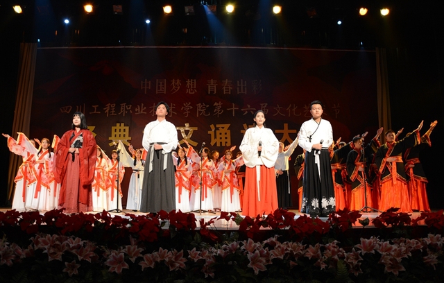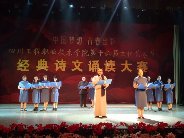 表演中,师生们时而激情洋溢,慷慨高诵,时而抑扬顿挫,轻声吟咏。《长歌浩叹唱古今》、《父母之河》、《秋瑾》、《青春中国》等耳熟能详的爱国名篇和经典诗文的美妙声音,在工院的夜空中久久回荡。