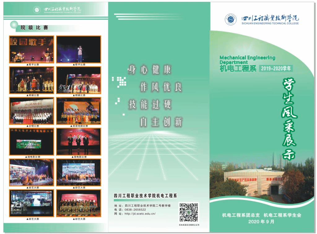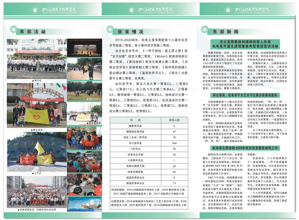 此外,机电系团总支在党总支的领导下,设计制作了学生风采展示宣传页,分为“系部活动”、“获奖情况”、“系部新闻”、“院级比赛”四个部分,以便让新生第一时间了解系部风采和校园文化,积极融入到工程学院这个大家庭中,并为开启崭新的大学生活定下目标。