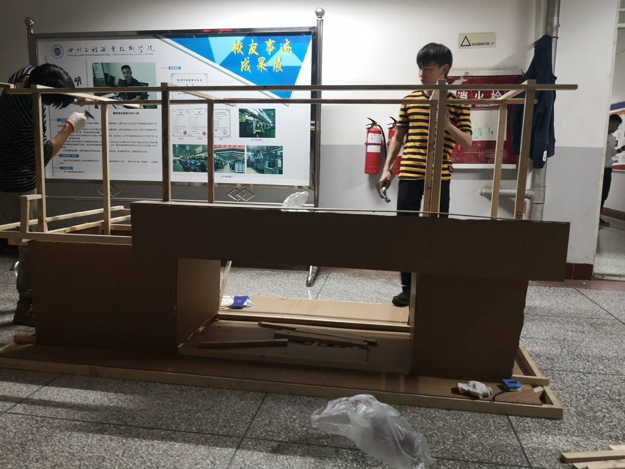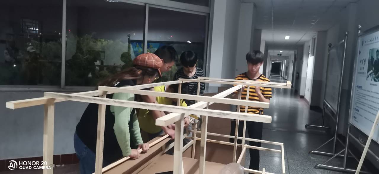 其中,2018机械制造与自动化专业承担了道具制作的任务。带着满满的的期待,看见了这样一群人,他们带着白色的手套,持着磨得发亮的手锤,开始他们的工作,“哗、哗、哗”,他们用锯齿在板材间来回运动着,听着整齐而又富有旋律的声音仿佛一首首的节奏乐在演奏;“砰、砰、砰”,他们用手锤在机床模型上重复敲打着,看着重复而又快速的动作似乎一个个的战士在拔剑而出。每天夜晚,他们都相聚在二教三楼,开始他们的辛勤劳动;一夜又一夜,一天又一天。他们用声音表达工作的艰辛;一张张的板材拼起满满的期待,用视觉见证机电儿女的梦想;一道道手中的伤痕,用努力诉说对工作的热爱。