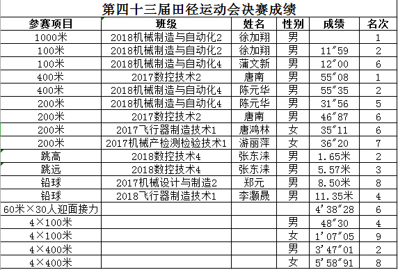 在当天早上的广播操比赛中,机电系101人的队伍高呼“机电机电,活力无限,团结拼搏,奋勇向前”的口号精神抖擞、活力十足,开场造型整齐有力,比赛动作规范到位,获得了第二名的好成绩。在随后的田径项目决赛中,机电系运动健儿奋力拼搏,田径比赛团体总分排名第三。