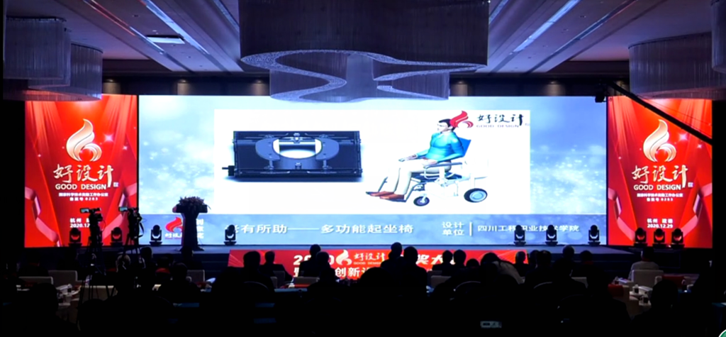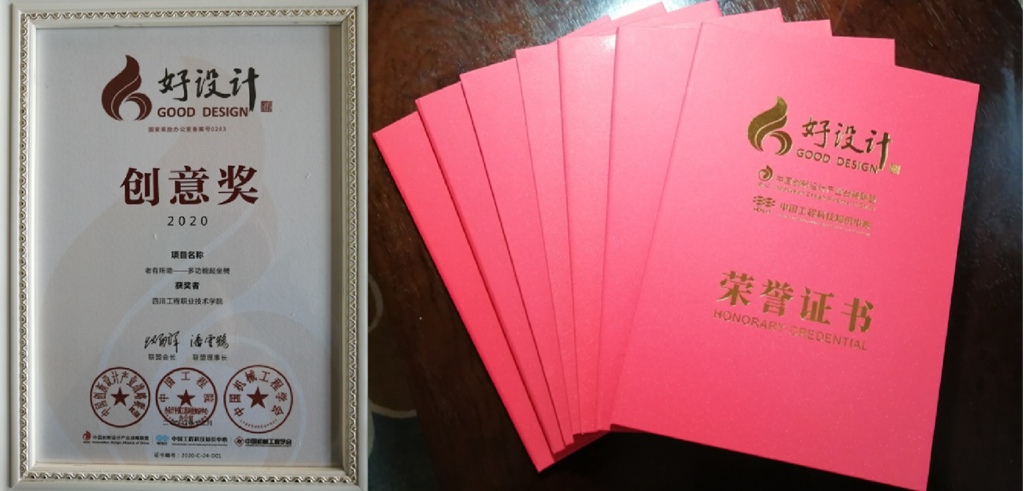 我系荣获“好设计·创意奖”的两项作品,均为第九届全国大学生机械创新设计大赛的全国一等奖作品,是由全国大学生机械创新设计大赛组委会推荐参评2020“好设计·创意奖”的5项作品中的2项。这2项获奖作品分别是王会中、李海鹏老师指导的《老有所倚——自动升降折叠式如厕助力装置》(团队成员为高端技能型本科班学生吴浩、旷嘉玲、童瑞年、向煊平、辜英政),王会中、曹素兵老师指导的《老有所助——多功能起坐椅》(团队成员为唐鑫、陈南希、罗杰浩、朱果、胡本莹)。(文/图 王会中)