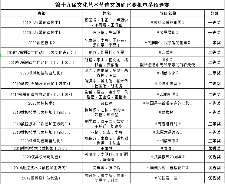 正值第十九届文化艺术节,为弘扬中华民族优秀传统文化,丰富同学们的课余生活,提高同学们的文化修养。2020年10月29日下午14:30,机电系在3b114教室举行了“第十九届文化艺术节诗文朗诵比赛机电系预选赛”。