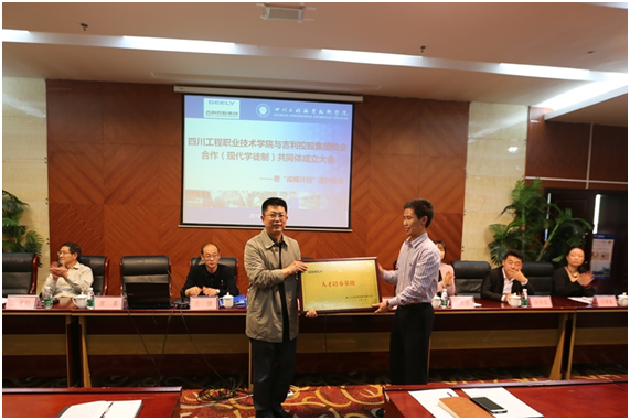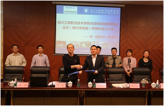我校是吉利汽车在西南地区合作院校之一。2017年6月开始,双方开展了多次项目建设研讨,吉利汽车控股集团提供了实训车辆、汽车技术资料、师资培训和认证等,学校也为此进行了场地调整、整修、文化建设、设备采购,选派了1名教师参加吉利师资培训和认证,同时选出我系最优秀的4名教师组建成“成蝶计划”项目教师团队,编写教学计划、课程大纲、教师手册、学生手册。吉利控股集团“成蝶计划”项目组的老师多次到校对学生进行宣讲、选聘学生,最终组建成由107名学生组成的四川工程职业技术学院“成蝶计划”首届“领克班”。
