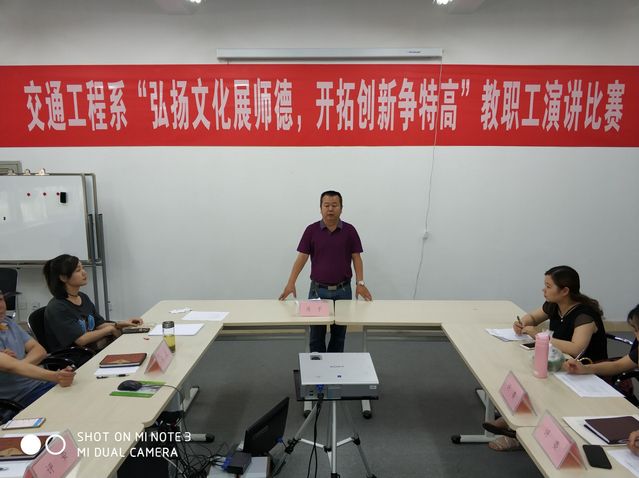 为了进一步加强师德建设,提高广大教师的职业道德素质,开拓全面争夺“特高”建设的成功,丰富教师的文化生活,交通工程系于5月22日下午2:30在工程中心北汽班教室,开展了“弘扬文化展师德,开拓创新争特高”为主题的教职工演讲比赛。交通工程系全体教职员工参加了比赛。