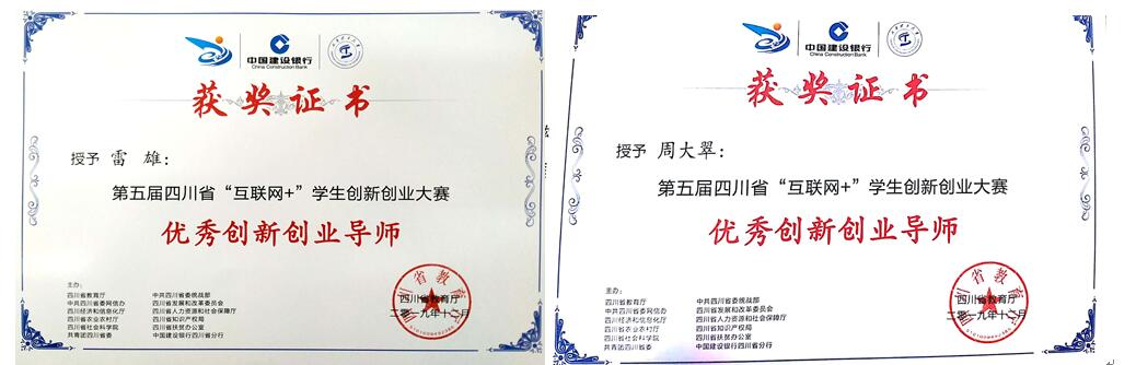 项目团队的周大翠、雷雄老师分别获得第五届四川省“互联网+”大学生创新创业大赛“优秀创新创业导师”称号。