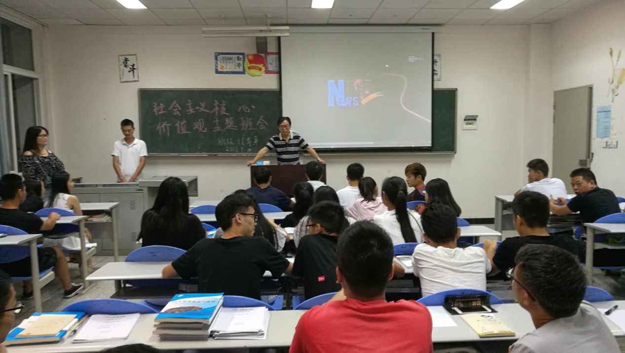2017年9月10日,2016级汽车车身维修技术1班组织召开“弘扬和践行社会主义核心价值观”主题班会,以“富强、民主、文明、和谐、自由、平等、公正、法治、爱国、敬业、诚信、友善”12个关键词为主题,讨论如何结合自身实际,培育和践行社会主义核心价值观。班级辅导员青燕老师、班级导师何贵老师出席此次班会活动。