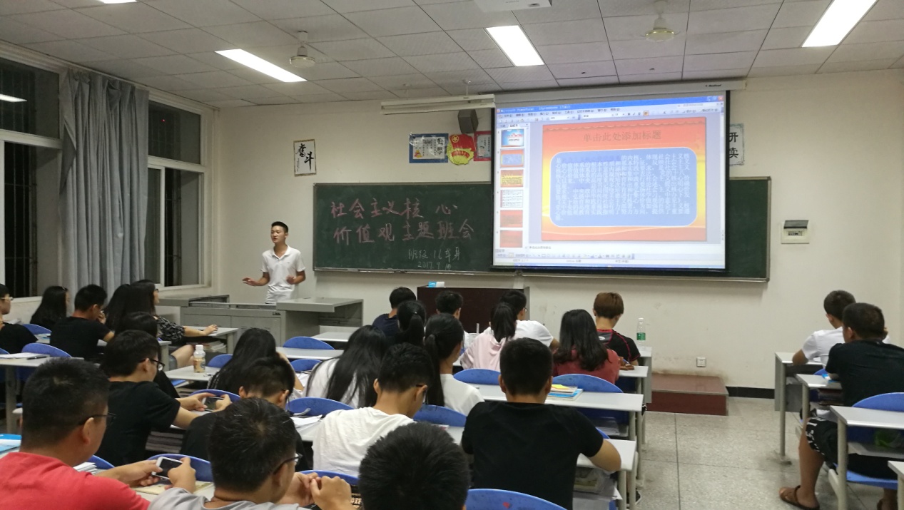本次主题班会由班级代表邓国平主持,首先由班级导师何贵老师讲解了提出社会主义核心价值观的背景和重要意义,接着介绍了大学生学习社会主义核心价值观的重要性,引入社会主义核心价值观的内容,让我们将社会主义核心价值观的内容铭记于心并践行。