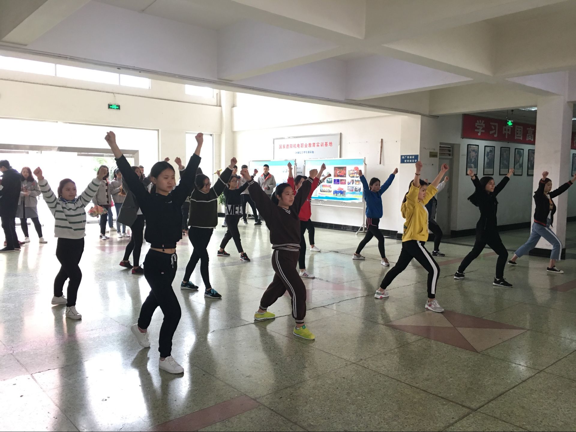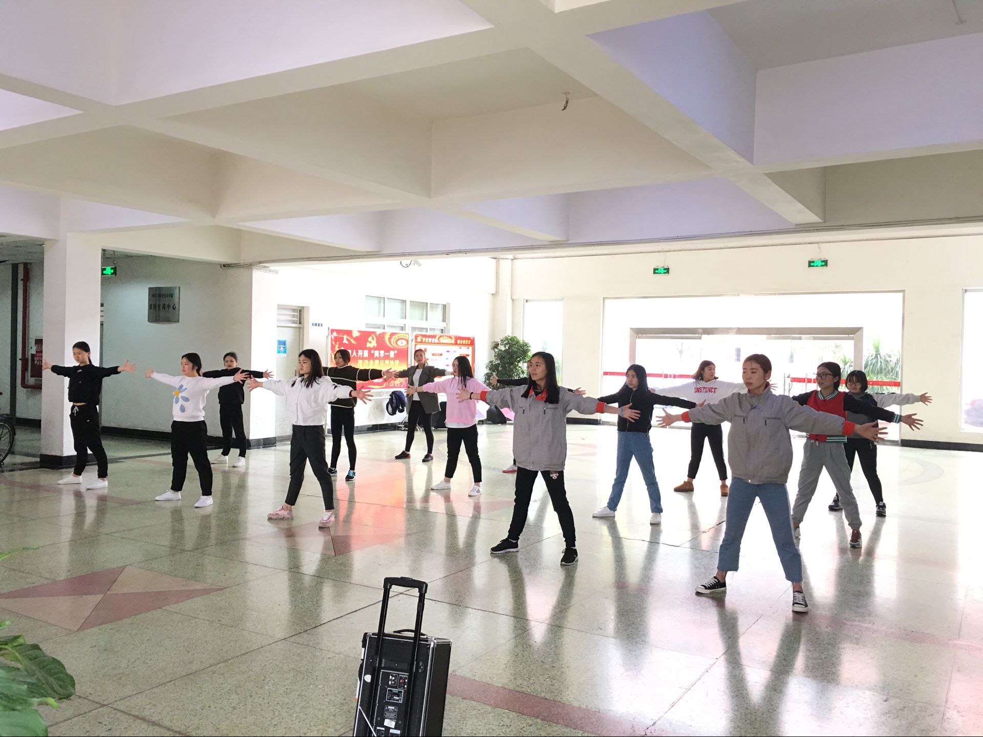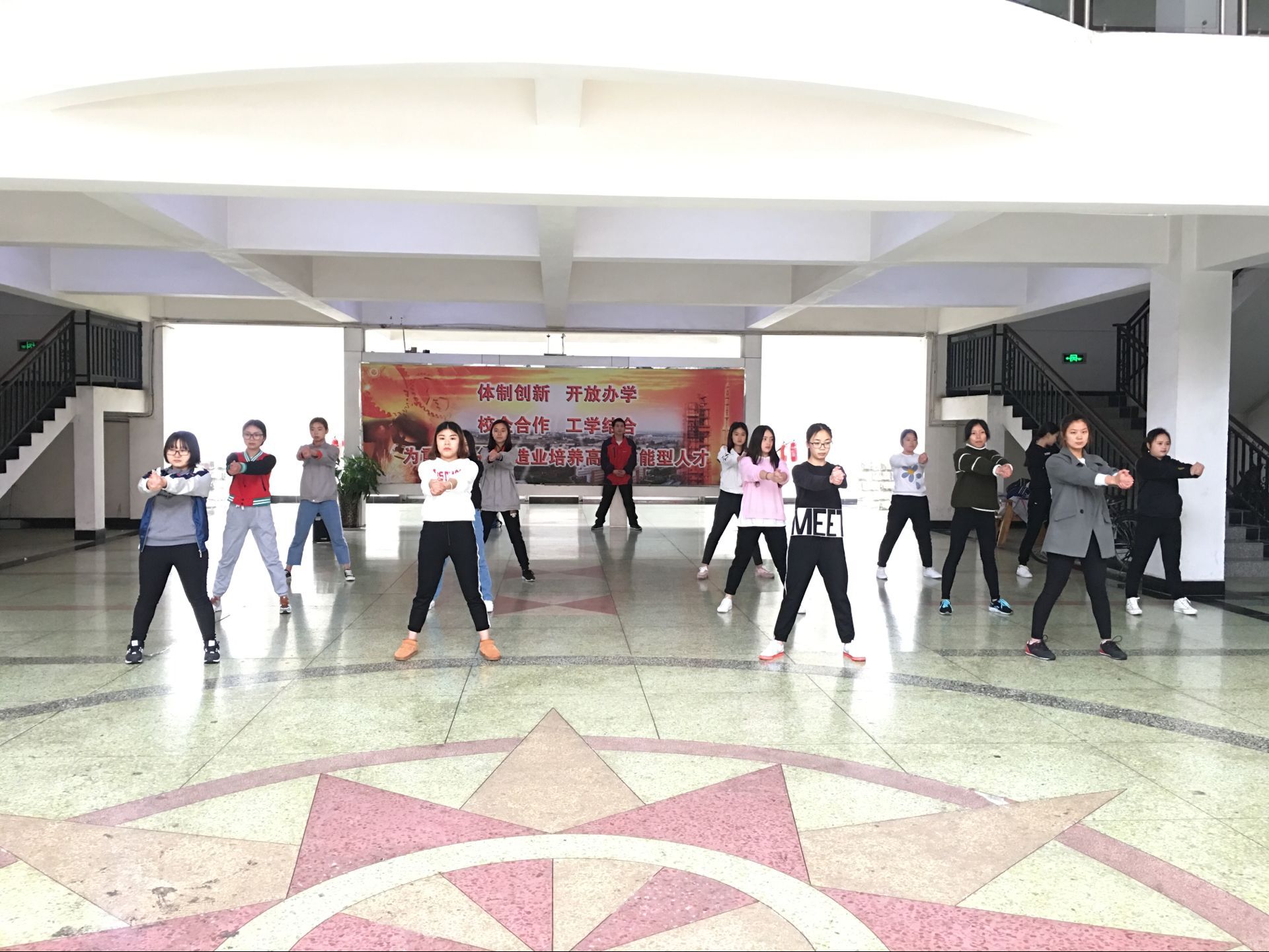 2017年3月21日中午,由于天气原因今天我系健美操训练活动转移至工程中心继续开展。在简单地集合清点人数之后大家先开始了活动筋骨和一些简单的准备活动,紧接着在音乐的伴奏下大家先将之前学习的前半部分动作进行了一次练习,学长学姐也将其中出现的一些问题进行了纠正,同时也从体态和神态面部表情等细节之处着手进行指导。按照学长的指导要求大家重复了一次动作,在加上同学们的微笑与更加夸张的身体语言之后感觉为这普通的健美操增色不少。