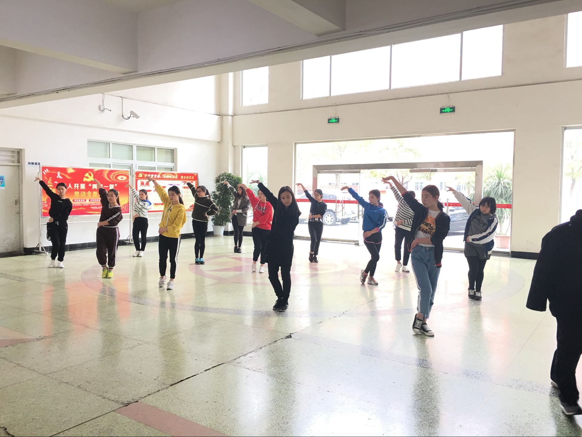 训练进行到一点钟左右时,前来上课的大二同学也好奇的围观起来,练舞的同学也跳得愈发欢快,仿佛自己此刻就置身舞台之上。