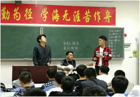 班会内容以学生才艺表演开始。每次班会上都有2—3个同学上台表演节目,全班每个同学每学期都有一次上台展示自我的机会,目的是为了培养大家的表达能力,让同学们锻炼胆量,敢于展现自我。本次班会我班的沈在明、陈志春、马学锋三名同学为我们表演吉他弹唱等节目,他们默契的配合,给我们带来了音乐的享受,赢得了大家阵阵掌声。