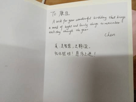 最后由班导陈静老师给我们讲话,首先班导对过生日的同学说了祝福语,给九月十月过生日的同学写了贺卡,我记得班导给我写的是“A wish for your wonderful birthday that brings a world of bright and lovly things to remember each day through the year”我深深的体会到班导对我们的祝福。班导还对我们班级提出了希望,我们每个同学都点点头表示可以做到。