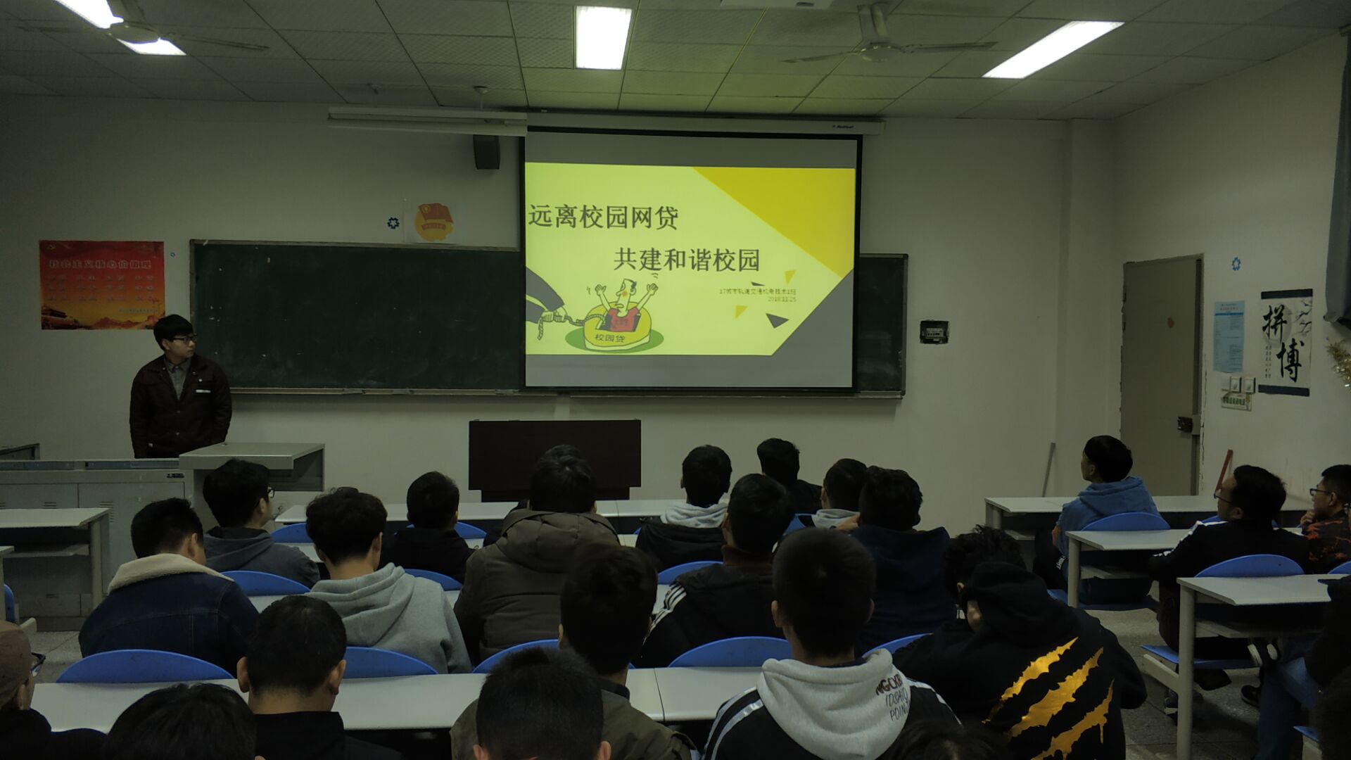 随着网络世界的发展,借贷平台在全国高校校园内蔓延扩散,为积极加入全国高校极力抵制校园贷活动。2018年11月25日晚,交通工程系2017级城市轨道机电技术1班的全体同学组织开展了以“远离校园网贷,共建和谐校园”为主题的班会,全体同学和班主任老师参加了此次主题班会活动。