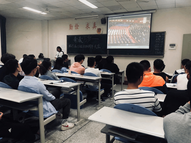 2019年5月4日晚上,2018级机电一体化1班全体同学在5B403教师开展了以“青春万岁一一纪念五四运动100周年”为主题的班会。在纪念五四运动一百周年之际,为了组织和引导在校青年大学生继承和发扬“五四精神”召开了此次主题班会。
