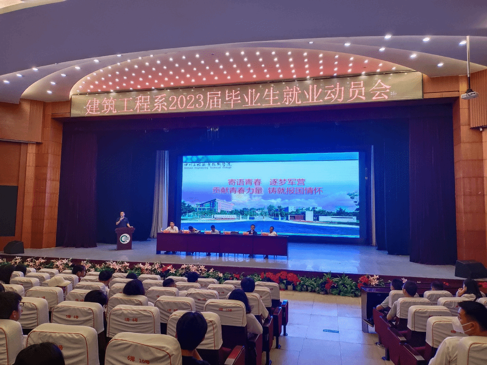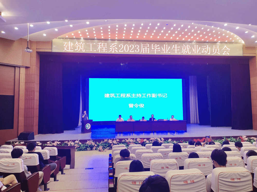 为推进建筑工程系2023届毕业生就业工作,帮助学生认清就业形势的严峻性,准确把握好就业机会,我系于2022年5月31日下午召开2023届毕业生就业动员会。党委武装部部长侯勇、系主任蒋明慧、系党总支主持工作副书记曾令俊、系学工组长张维以及各教研室主任、各班班级导师、辅导员等参加大会,动员会由系副主任聂根良主持。按照疫情防控要求,本次大会在二教演讲厅设主会场,部分班级在教室分会场通过视频直播的方式参会。