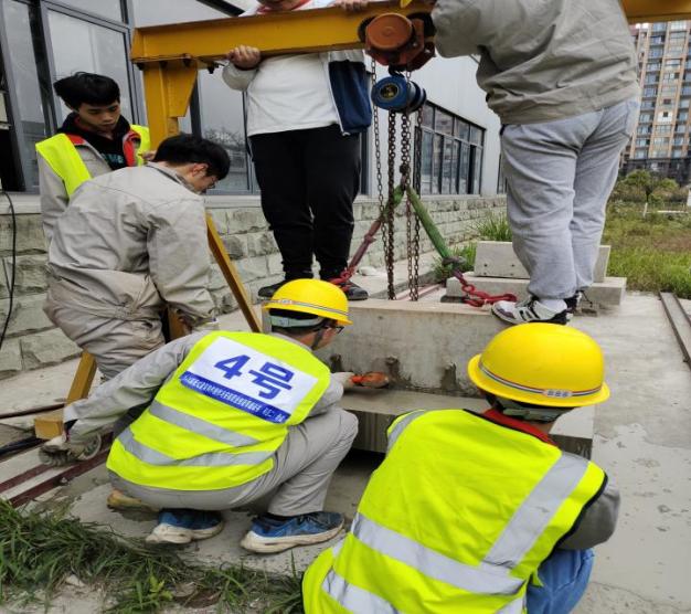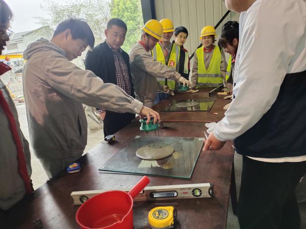 首先,指导老师对在现场组装需要注意的地方进行了详细讲解,让学员们对叠合板的组装有了更加直观的认识;然后老师带领学员进行了灌浆料的流动度测试。学员们还亲身体验了灌浆料流动度测试的全过程,掌握了灌浆料流动度测试的所有步骤;灌浆料流动度测试完毕后,学员和老师一起进行装配式施工虚拟仿真软件的模拟练习,加深了同学们对构件灌浆过程的印象。