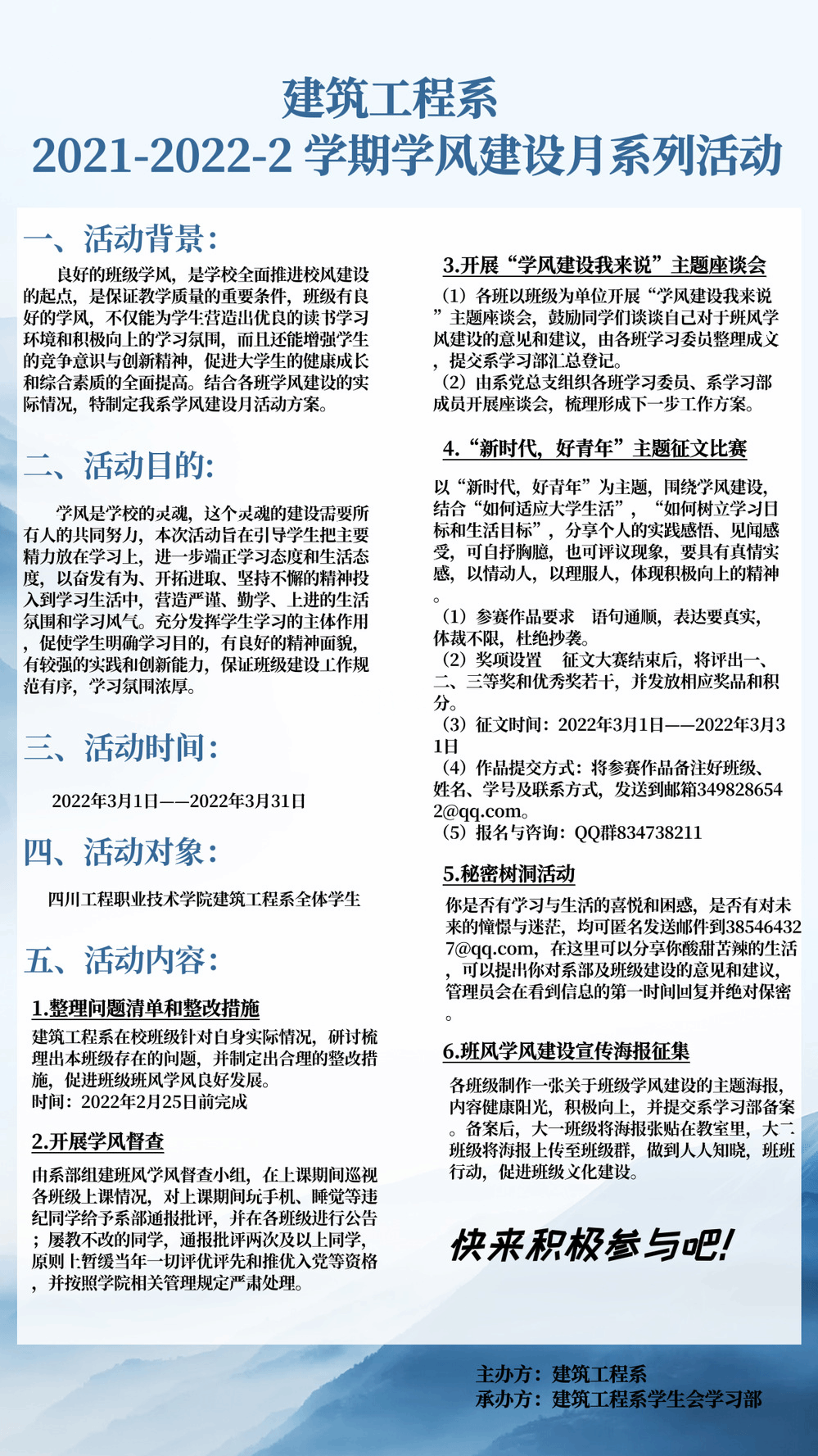 为提高学生的自律意识,营造优良的学习氛围,进一步加强班级建设,建筑工程系2021-2022-2学期学风建设月活动正式启动。本次活动旨在引导学生端正学习态度、规范学习习惯、明确学习目的,树立学生热爱学习、学会学习、善于学习的观念,学会如何更有效率的学习。