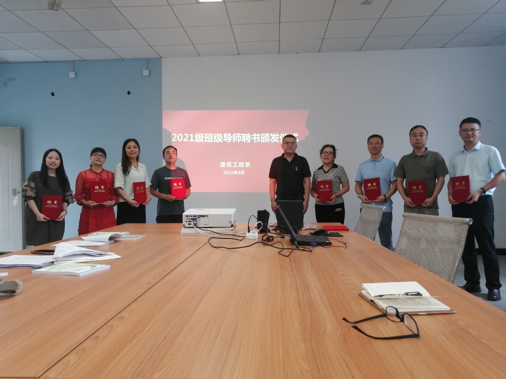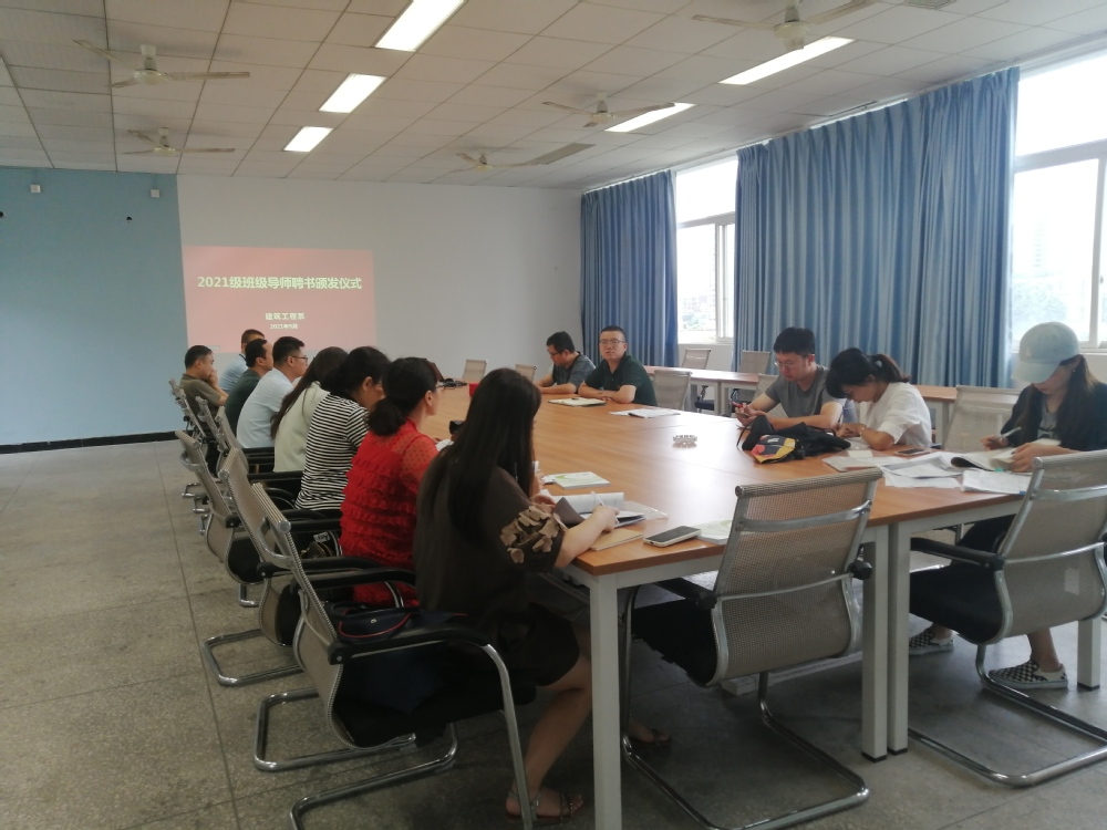 2021年9月15日下午,建筑工程系2021级班级导师聘书颁发仪式在5A401会议室举行。由系党总支副书记(主持工作)曾令俊主持,系党总支委、2021级全体辅导员、班主任和班级导师参加会议。