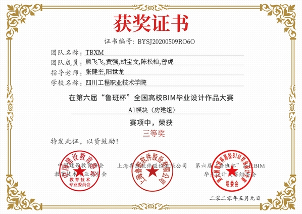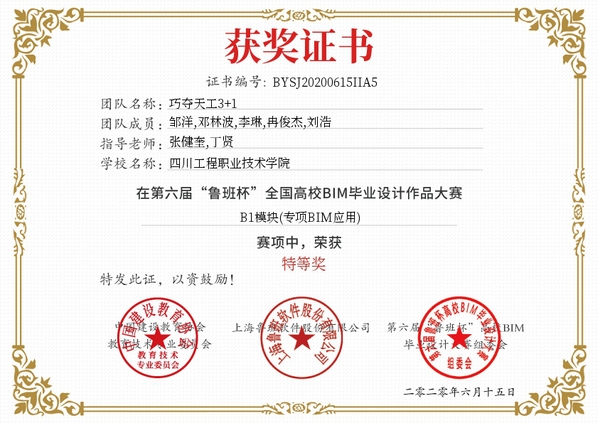 2020年6月13日,由中国建设教育协会主办,上海鲁班软件股份有限公司承办的第六届“鲁班杯”全国高校BIM毕业设计作品大赛总决赛圆满落幕。我校建筑工程系组建的“巧夺天工3+1”团队作品《秦皇岛博物馆施工阶段BIM技术应用》获得BIM专项应用特等奖、BIM建模一等奖。获奖团队由张健奎、丁贤、徐萍老师指导,由18级建筑工程技术邓林波、李琳、邹洋,工程造价冉俊杰和园林工程技术刘浩、黄乾权6位同学组成。