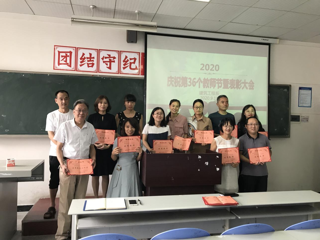 在第36个教师节来临之际,为激发广大教师爱岗敬业、改革创新和无私奉献的光荣感和使命感,9月10日下午,建筑工程系举行了“庆祝第36个教师节暨表彰大会”。大会上,系党总支书记蒋明慧宣读了学校关于2019-2020学年表彰的决定,并对获得先进集体、优秀教育工作者和优秀教师的集体和个人颁发了荣誉证书。