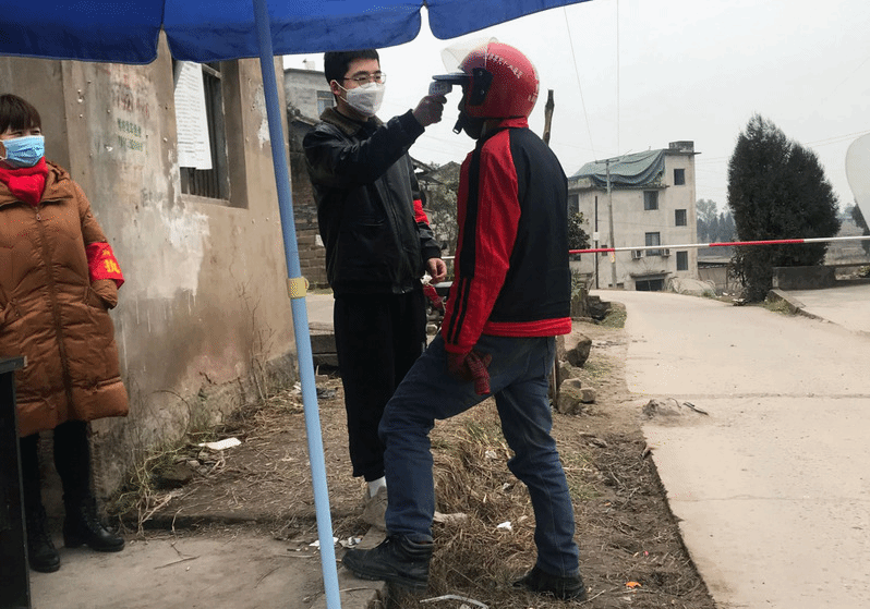 2017级建筑装饰2班程易,在家乡雅安农村值守路口,检查出入人员身份和体温情况。