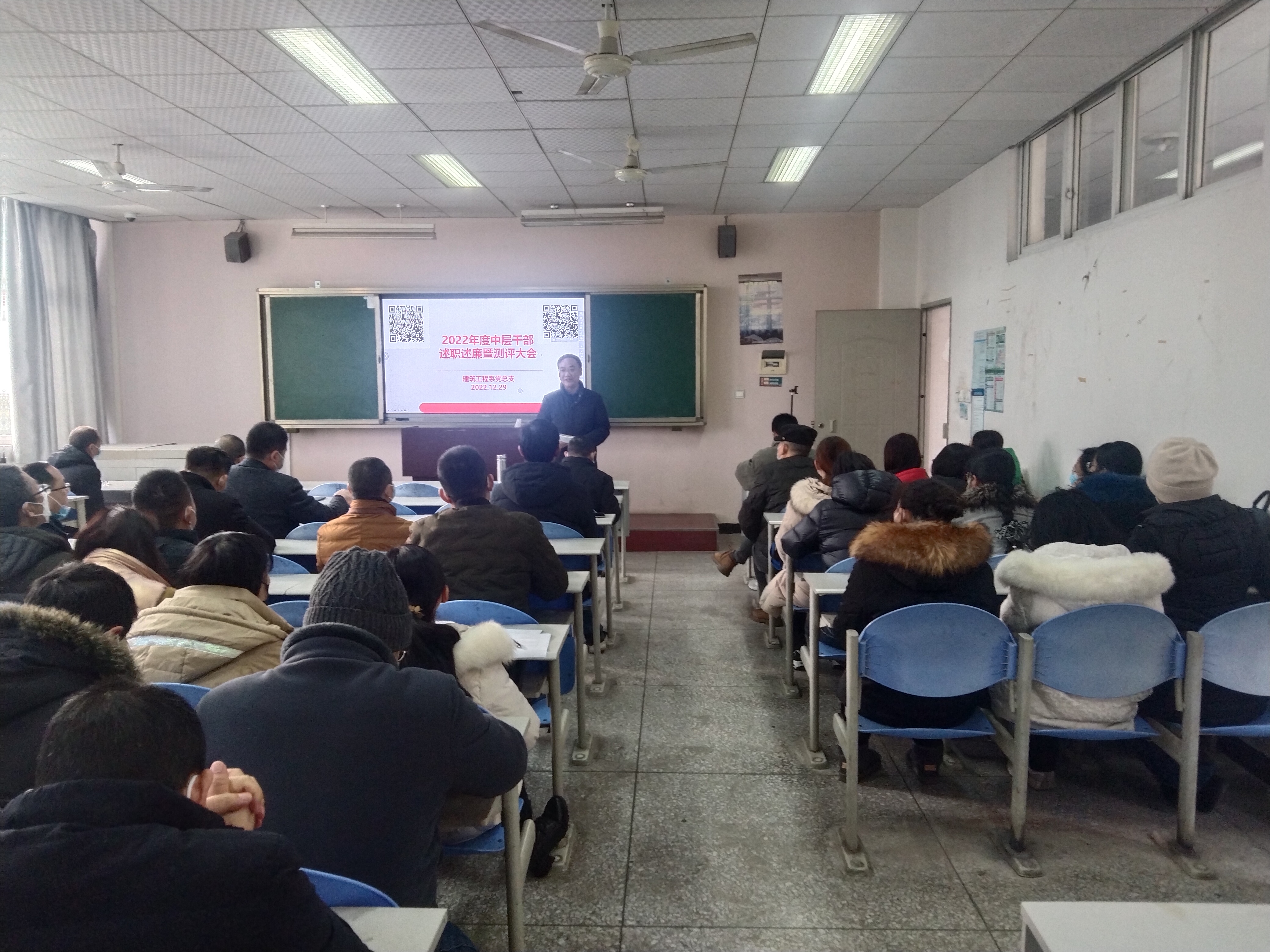为强化学校干部队伍建设,不断完善干部管理和考核机制,为“创本科、建双高”提供强有力的干部人才支撑。按照学校党委统一部署,2022年12月29日下午3点,建筑工程系在5B310召开2022年度中层干部述职述廉暨测评大会。大会由学校党委常委、组织部部长龙斌主持,全体教职工参加。