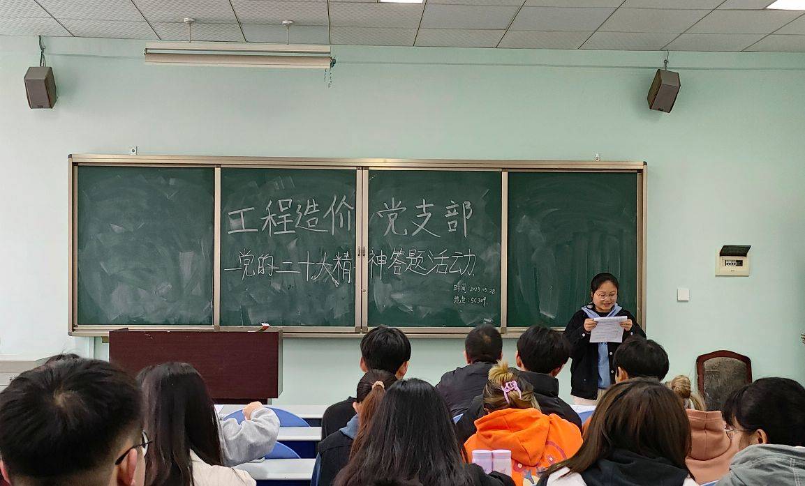 为了深入贯彻党的二十大精神,2023年3月28日中午13:20,工程造价专业党支部在5C309举行关于党的二十大精神专项答题活动,活动由王雨菲同学主持,支部全体入党积极分子参加。