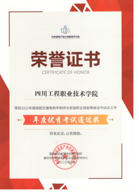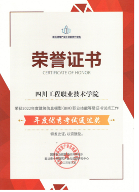 2023年4月28日,我校建筑工程系收到了由廊坊市中科建筑产业化创新研究中心(国家职业教育培训评价组织)颁发的1+X装配式建筑构件制作与安装职业等级证书、1+X建筑信息模型(BIM)职业等级证书试点工作“年度优秀考试通过奖”荣誉证书。