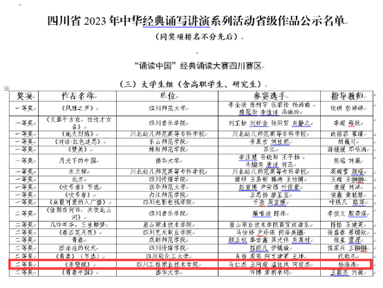 为了弘扬中华传统文化,传承文化经典,由四川省委宣传部、省语委、省委教育工委、教育厅共同主办的四川省2023年中华经典诵写讲演系列活动于2023年9月22日进行最终获奖公示。