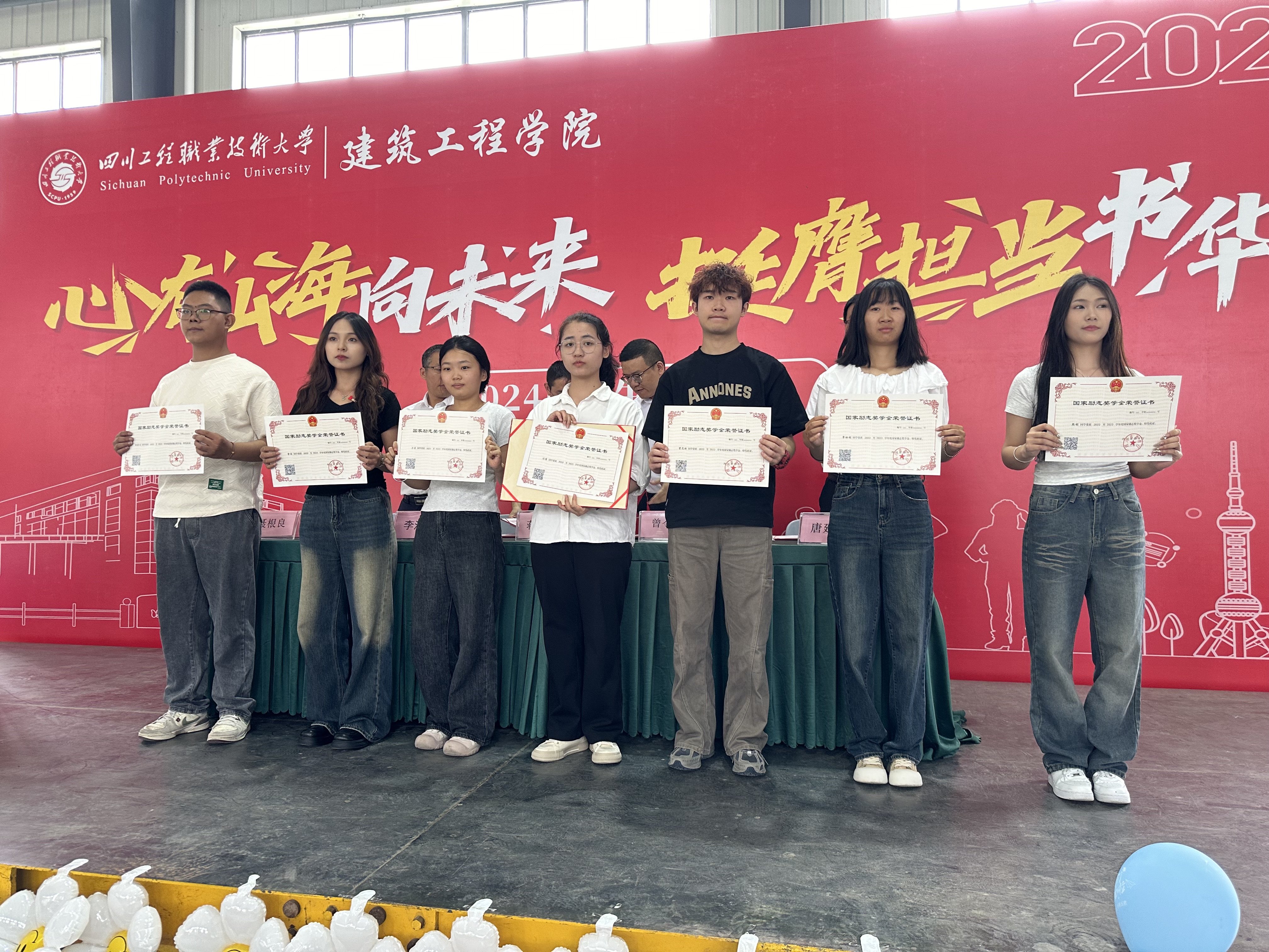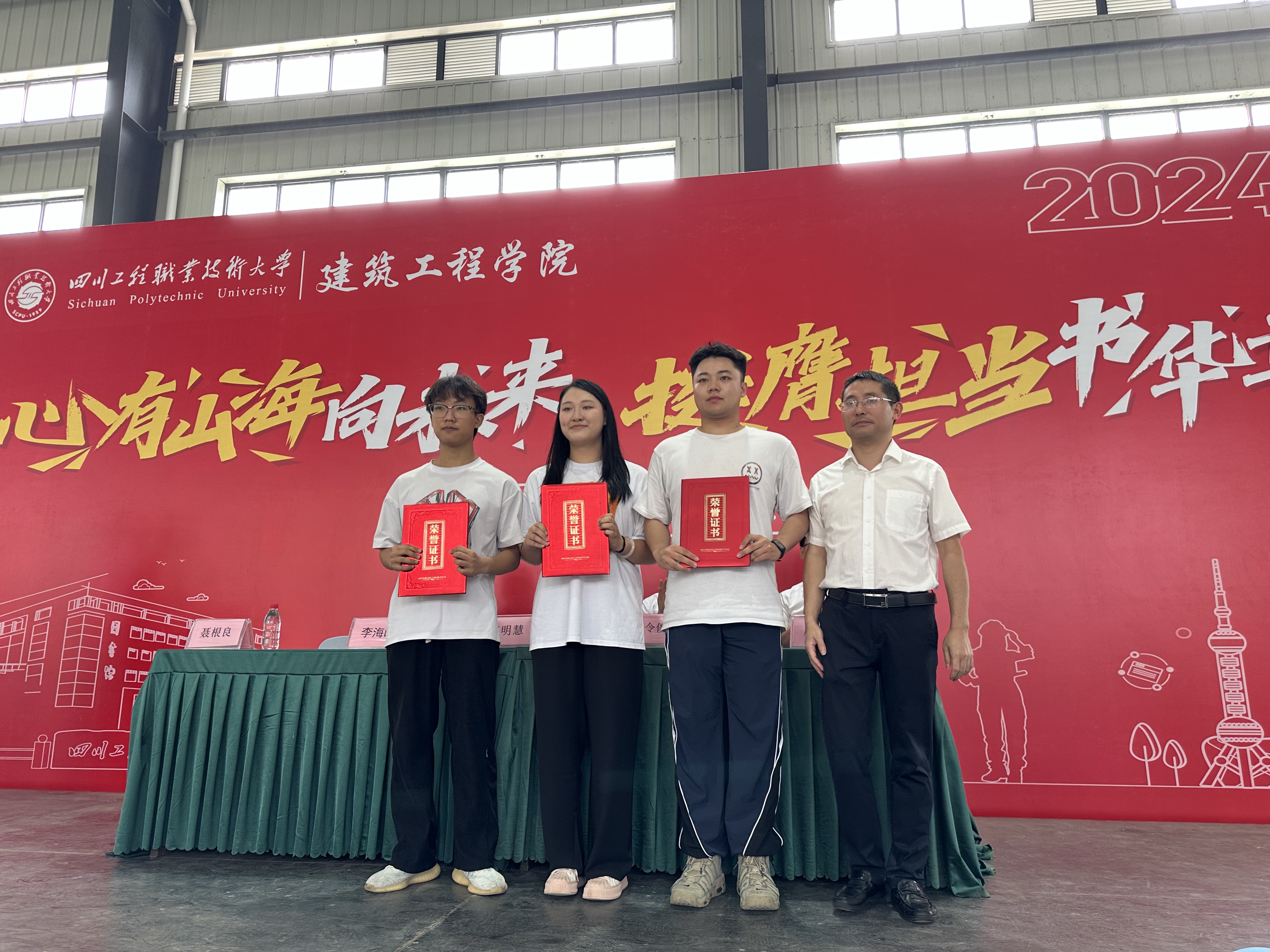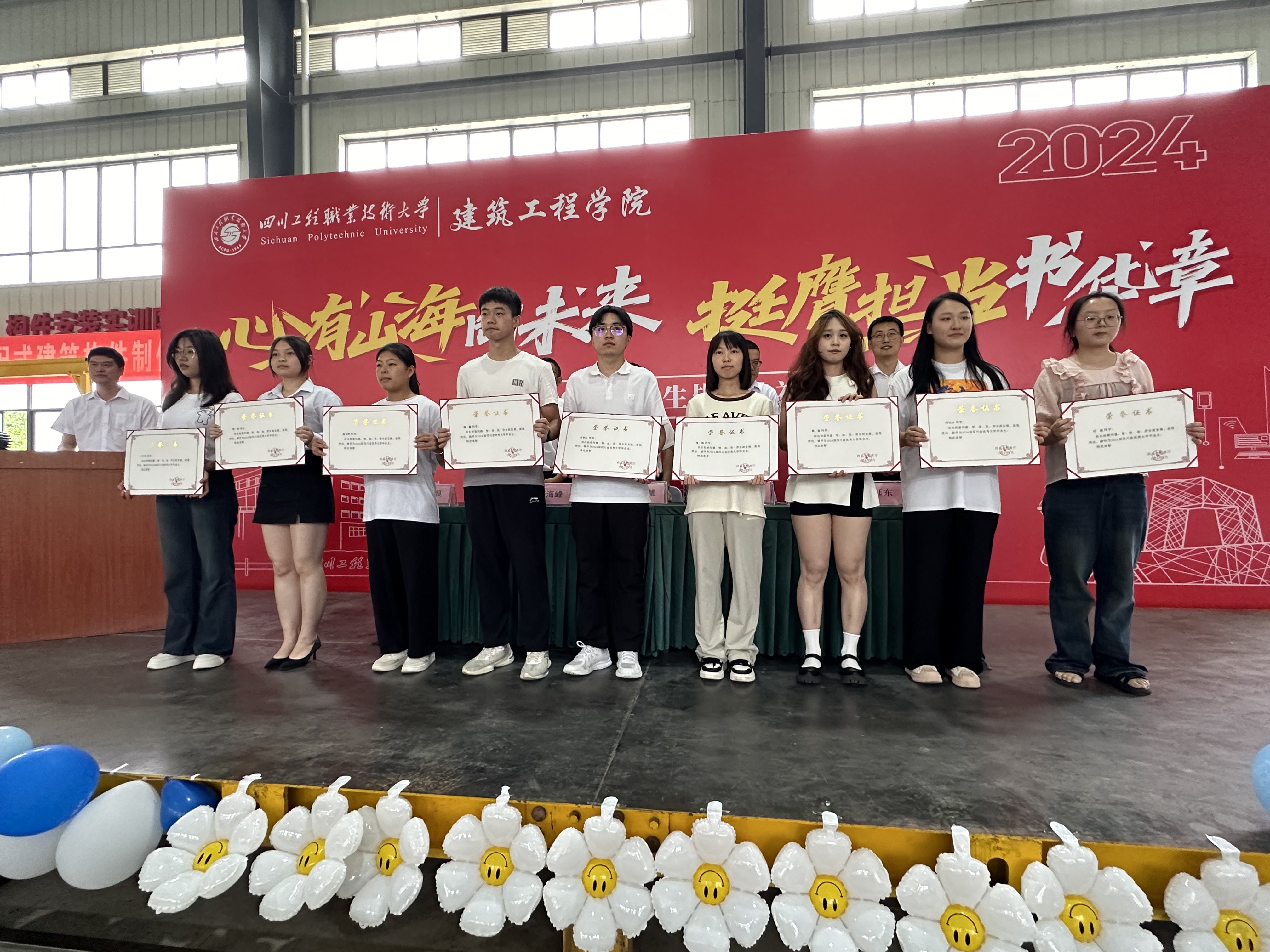 活动在雄壮的国歌声中拉开了帷幕,学院领导李海峰宣读了学校的表彰决定,本学年荣获国家励志奖学金、国家奖学金以及四川省优秀大学毕业生的学生代表上台领取了荣誉证书。学子邱佳怡、杨程、邓志鹏组成的团队在2023年全国职业院校技能大赛高职组“装配式建筑智能建造”项目中勇夺一等奖,填补了四川省代表队在该赛项最高奖的空白,学院领导蒋明慧亲自为他们颁发了获奖证书。