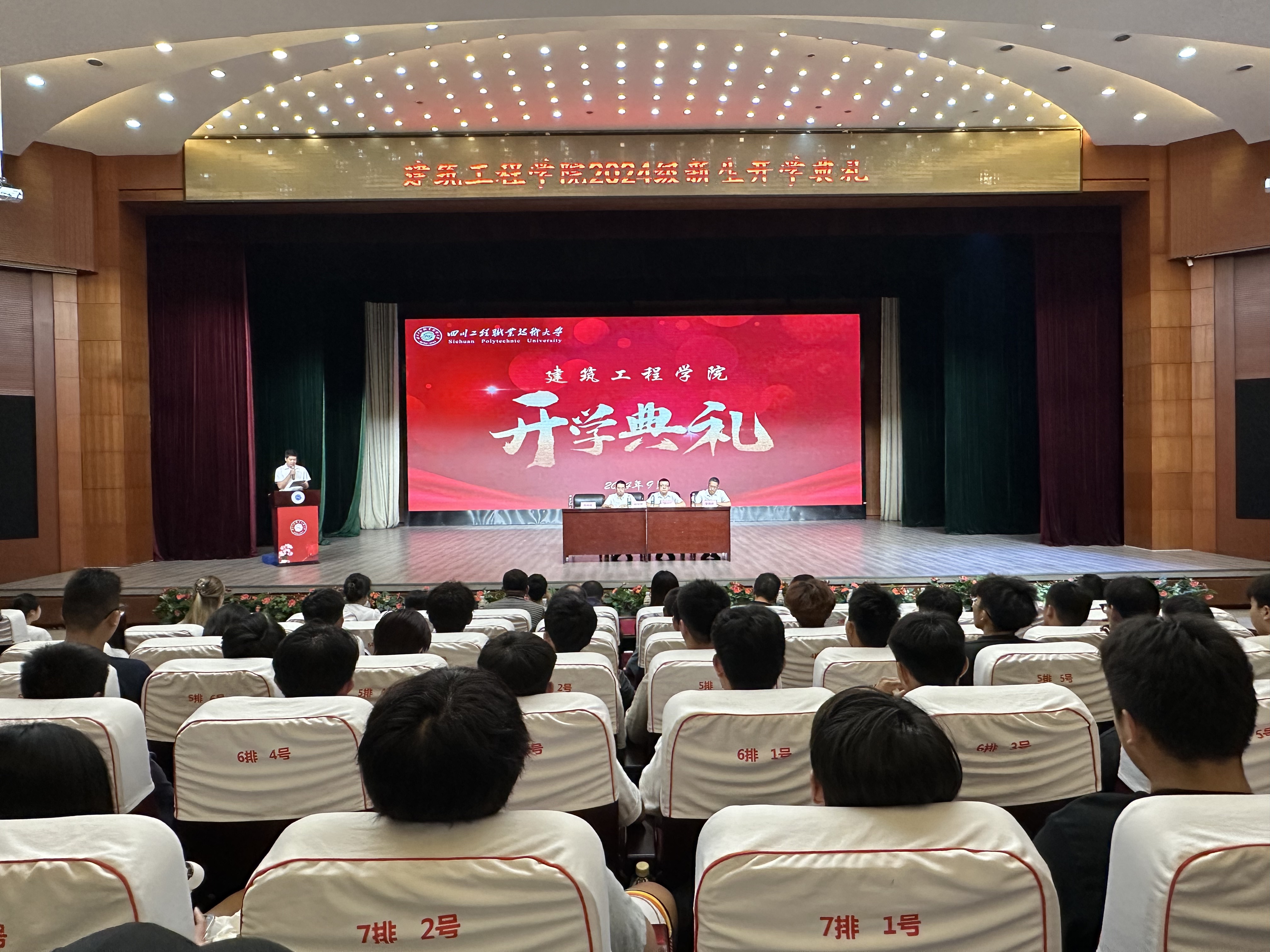 2024年9月14日上午,建筑工程学院2024级新生开学典礼在二教演播厅隆重举行。典礼由建筑工程学院副院长、党政办主任聂根良主持,建筑工程学院党委副书记、院长蒋明慧,党委书记曾令俊,副院长李海峰以及各专业教研室主任、教师代表、在校生代表等出席典礼。
