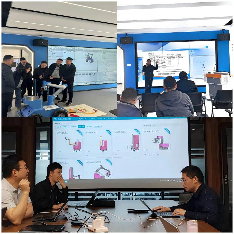 随后,工作室成员对“机器人路径规划”“机器人虚拟仿真系统应用”“机器人协同管理”等内容进行了系统性学习,并与企业人员就建筑机器人的应用场景、技术的研发与突破和人才培养方案等重要问题展开深入研讨。并在以下三个方面达成合作意向:1.校企双方加强合作,共同培养满足建筑智能化施工技术与管理等岗位(群)新要求的高素质技能人才;2.加强技术研发与项目攻关合作,共同推动建筑机器人技术创新和产业升级。