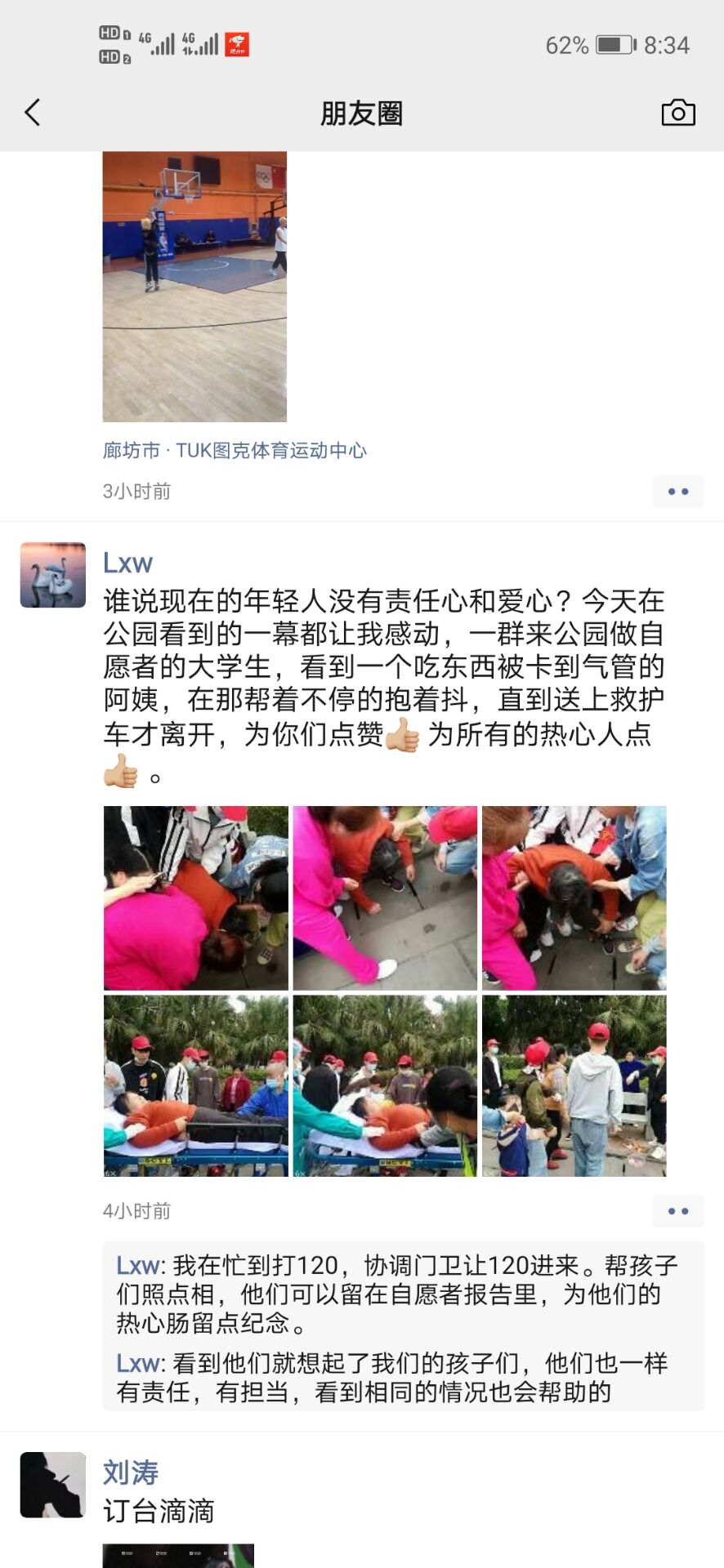 在2021年4月8日下午2:00,建筑系青志部在志愿活动进行中,一位阿姨被食物卡住喉管,情况十分严重,在听到有路人呼救后,19级建装2班的同学刘建军,黎彦君,戚翰宸,周赟杰,罗义平,彭愉淋,赵恒纷纷上前帮忙,按照视频中医生的指导为阿姨做了急救措施,等到将阿姨送上救护车才离开。