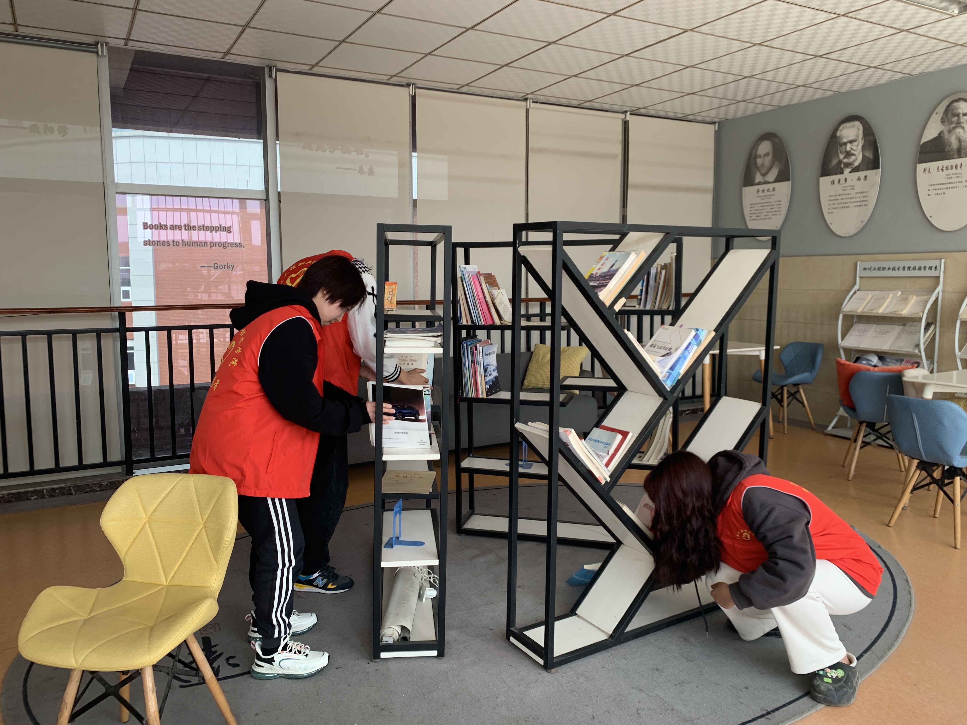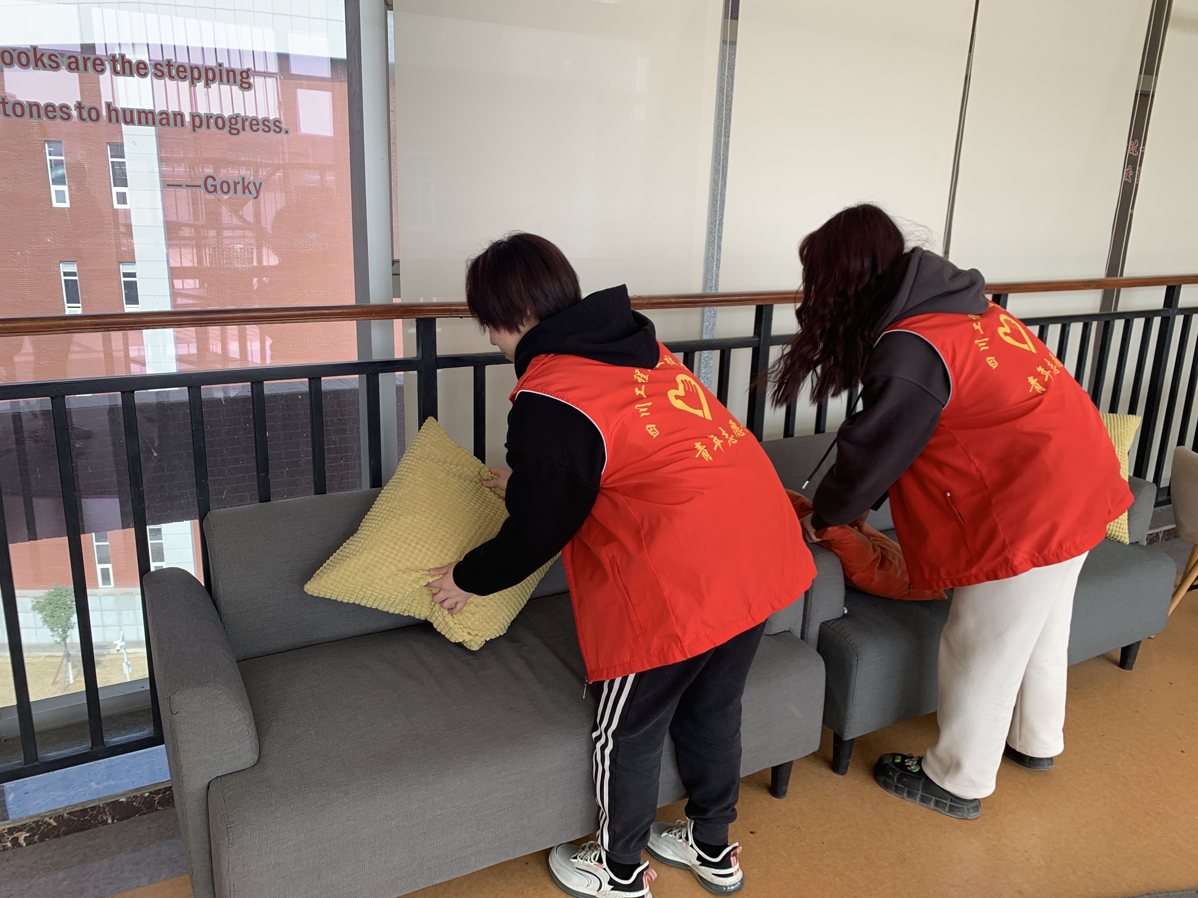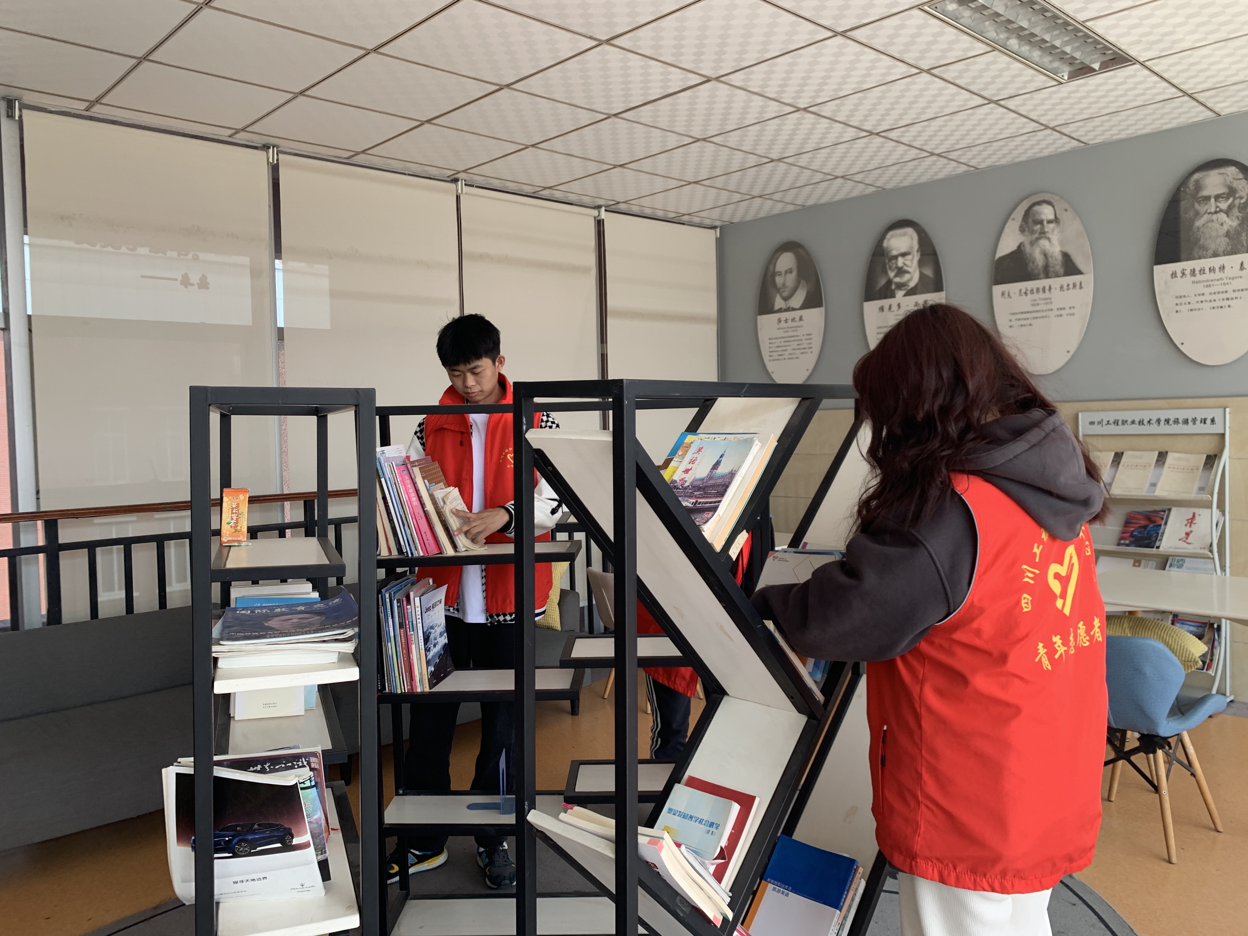活动中,大家秉持着为系部师生服务的理念积极主动作为,讨论图书如何摆放更方便同学们拿取阅读,有序地整理歪倒的图书,扫走书架上的灰层,清理走廊上的垃圾。在每一位志愿者的热情干劲下,心远读书吧和周围教学走廊环境干净整洁,物品摆放有序,为师生们提供了干净舒适的学习阅读环境。